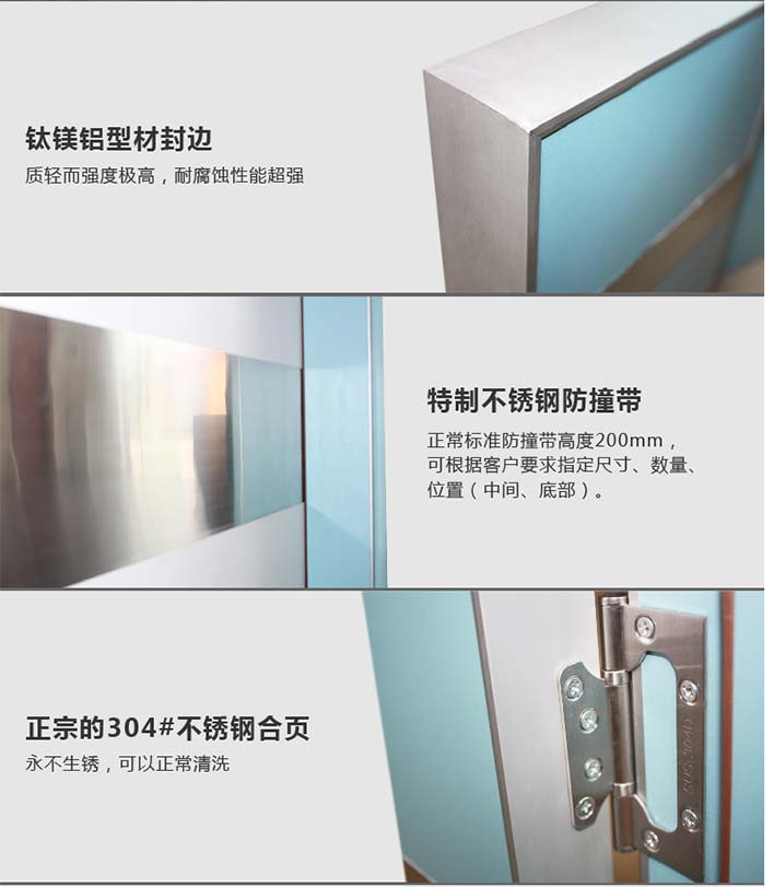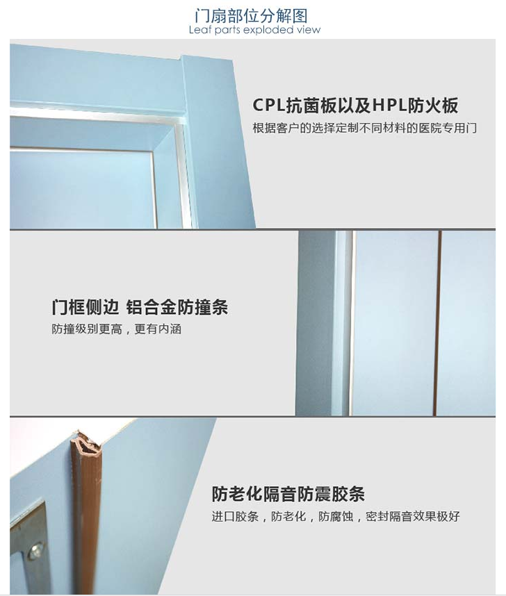 产品特点:【材质】:HPL/CPL 【规格】:2100*900*45 【门扇厚度】:45mm(如添加钛镁铝型材封边厚度为47mm) 【生产周期】:15天 【表面材质】:CPL防火抗菌板 【内部结构】:实木结构材料、特制高碳方形钢管 【工艺特点】:防火、抗菌、环保、防潮、不变形、抗冲击、耐磨、易于清洁 医院是以提供医疗、保健、 预防、教学、科研为一体的重要社会医疗基础设施,它为社会各界人士提供医疗保健服务,是人类健康繁衍的重要保障;医院专用门 作为医院内使用频率高的产品及医院的 对外窗口,它的质量就显得尤为重要;医