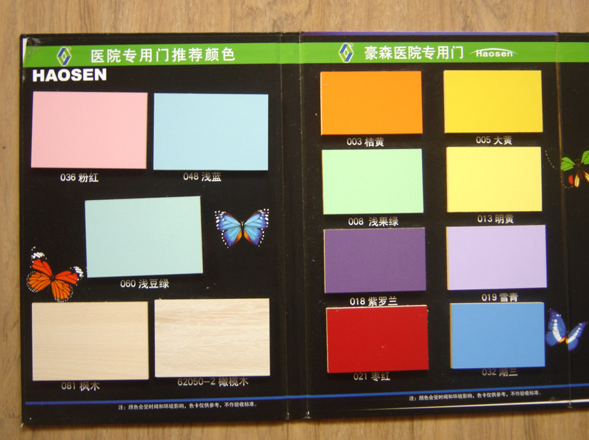 产品特点:豪森医院专用门为国内知名品牌,豪森医院专用门生产厂家自助研发品牌,豪森医院专用门饰面为防火抗菌板,内衬蜂窝雀巢阻燃网格高密度板,豪森医院专用门分为两大系列:防火抗菌板门及CPL防火板门,下面着重为大家介绍一下豪森两大系列医院门的特点: 一、门板覆面树脂防火抗菌板 1、表面材质为热固化高密度树脂材料,无毒环保、无甲醛、苯(可做眼镜片、餐具等) 2、强耐磨(硬度可达6500转) 3、BIO矿物质抗菌 4、耐酸碱 5、防火(防火等级达到二级) 6、防紫外线,不变色 7、防静电 8、色彩艳丽丰富(60多种) 二、